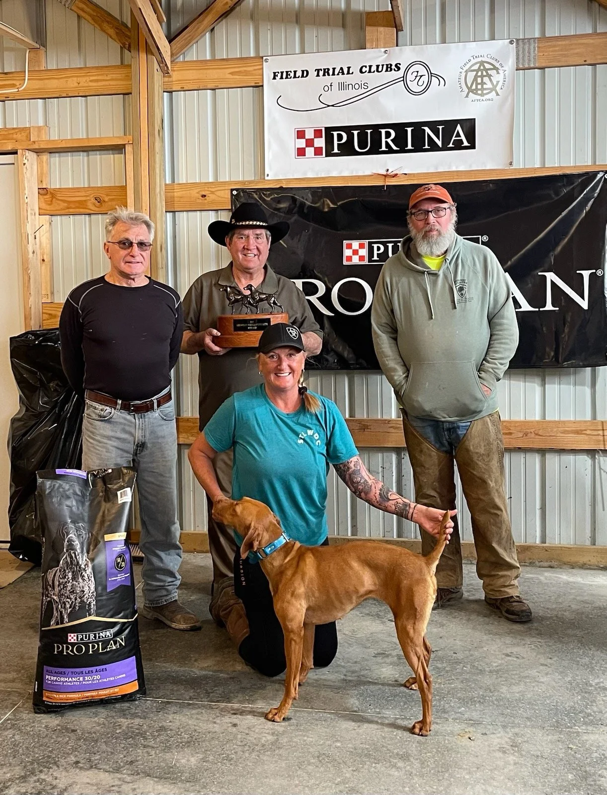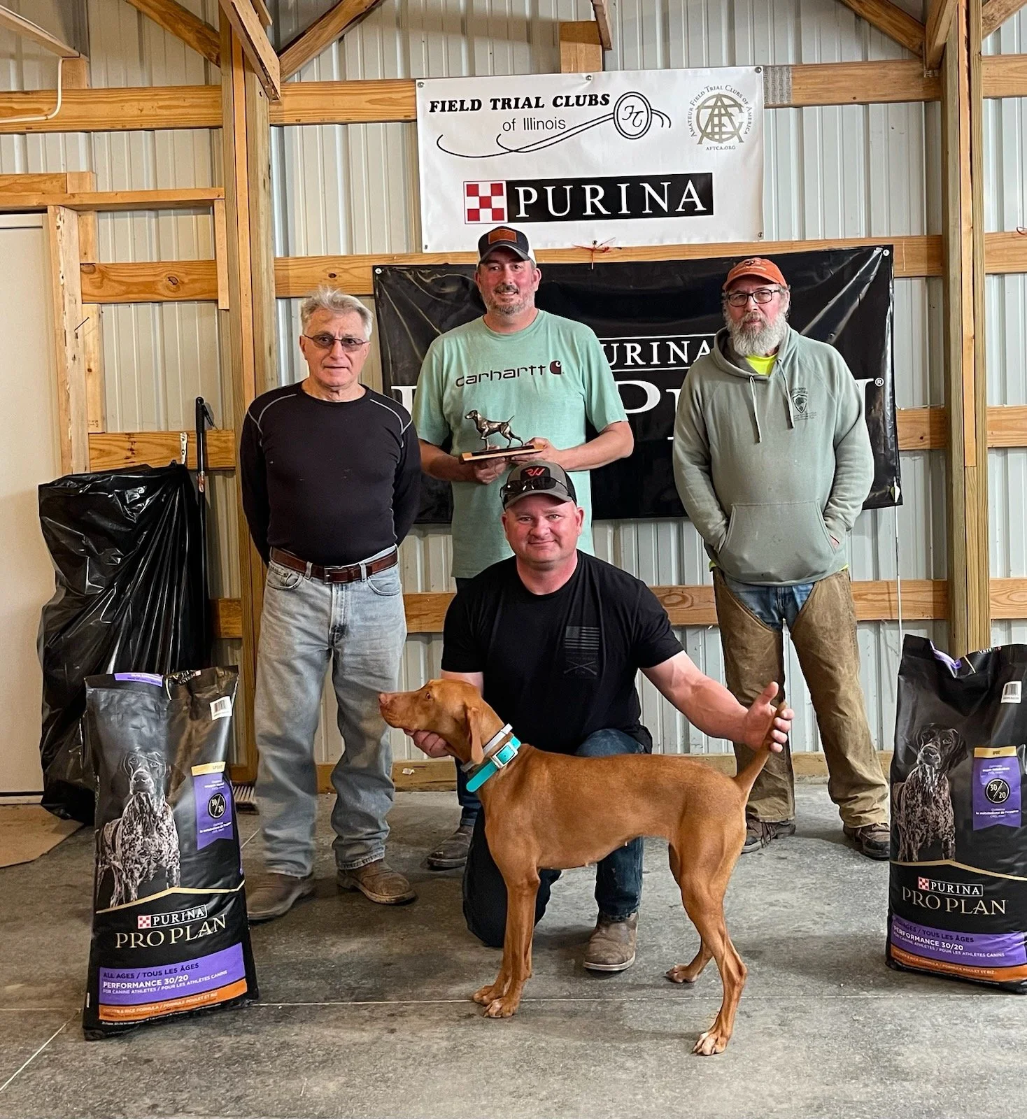 A special thanks to Nestle Purina for their sponsorship and continued generous support of this event and field trials in general. We also have a number of people to thank for their support of this event, including volunteers from the Vizsla Club of Illinois who helped run the dog wagon, planted birds, helped with the drawing, and prepared a delicious lunch. Thank you to Justin Hess for posting pictures and results online and for running our Derby calcutta. We also had a good group of people in the gallery who enjoyed watching these young Vizslas perform.
